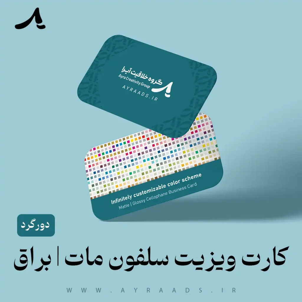 کارت ویزیت سلفون مات و براق دورگرد، از کاغذ گلاسه ۳۰۰ گرم با سایز استاندارد ۹۰×۶۰ میلیمتر، مناسب تیراژ ۵۰۰ به بالا. این کارتها با روکش سلفون مات یا براق و برش دورگرد، جلوهای حرفهای و ماندگار دارند، همراه با طراحی حرفهای، بهترین متریال و کیفیت چاپ، ارسال رایگان در قم، گارانتی و تضمین بازگشت وجه، با امکان چاپ عادی یا فوری.